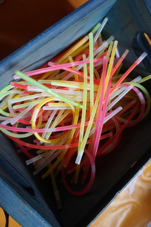 Die Diskokugel ist kaputt, ich pack stattdessen Knicklichter ein, drei Päckchen. Die kommen immer gut an und machen auch eine tolle Lichtshow.
