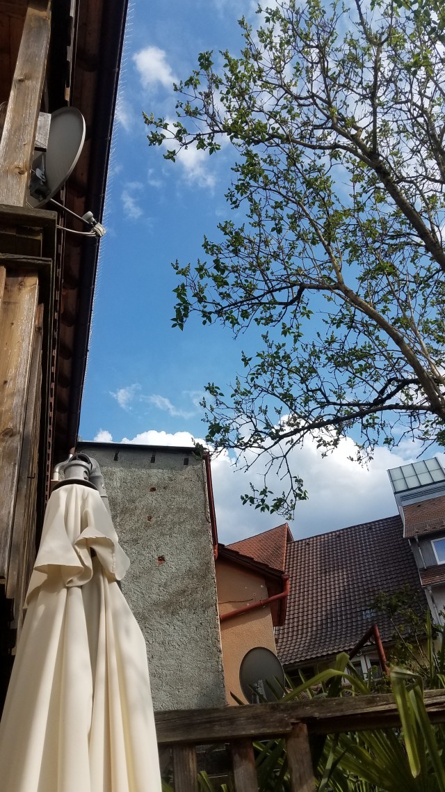 Wir haben ein ziemlich kleines Stück, auf das wir nichtsdestotrotz sehr stolz sind. Wir müssen drei Stockwerke hoch und runter gehen, und wenn wir unten essen, bin ich unentwegt am Treppensteigen und trainiere mir die Mahlzeit gleich wieder ab. Aber wir haben einen Platz zum Draussen-sein, und das ist die Hauptsache. Wir haben es selbst gerichtet. Vordem standen da zwischen modrig gewordenen Schilfmatten die Mülltonnen und lagerten gelbe Säcke. Schön war das nicht. Die Schilfmatten sind längst weg. Wand und Mauer zum höherliegenden Grundstück sind weiß gestrichen und weil ich so gerne mal nach Griechenland ginge, mit einem blauen Streifen verziert, und außerdem in strahlendem Gold Sonne, Mond und Sterne. In der Mauer, die doch recht brüchig war, sind mittlerweile ausrangierte Steine des Schwarzen Tors verarbeitet, was unsere Parzelle ein wenig adelt, meine ich. Wir haben eine Gartenbank rosa angestrichen und als Hollywoodschaukel an die Wäschestange gehängt, es gibt Platz für Tisch und Stuhl, Sonnenschirm und sogar eine kleine Planschwanne. Am Zaun hängen Blumentöpfe. Die Palmen haben nicht mehr reingepasst; die stehen im größeren Teil des Nachbarn aus dem Erdgeschoß und tun das wohl – so ward dem unser Einzug in ´seinen´ Hof auch versüßt.